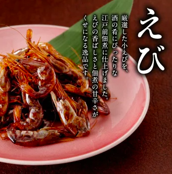 天然えびを、化学調味料不使用の昆布だし×本みりんで丁寧に煮込んだ逸品。